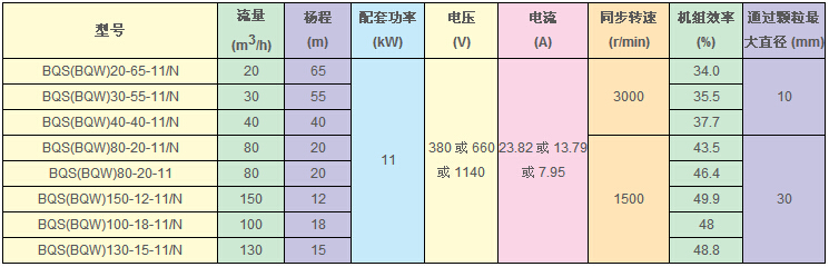 BQS(W)11KW的礦用隔爆型排污排沙潛水電泵技術(shù)參數(shù):