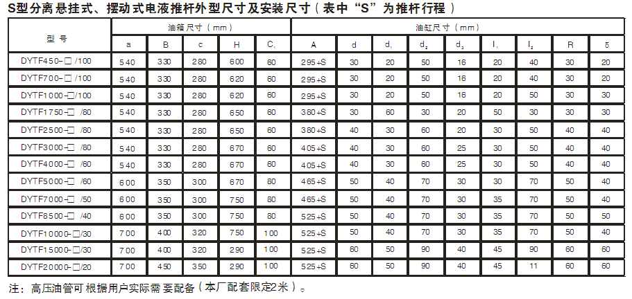 - DTYF型分離式電液推桿是一種集機(jī)、電、液為一體的液壓驅(qū)動(dòng)機(jī)械手,適用于需要往復(fù)推拉直線(或往復(fù)旋轉(zhuǎn)一定角度)運(yùn)動(dòng),也可用于需要上升、下降或夾緊工作物的場(chǎng)所,并可實(shí)現(xiàn)遠(yuǎn)距離危險(xiǎn)地區(qū)的集中或自動(dòng)控制。已廣泛應(yīng)用于冶金、礦山、電力、煤炭、機(jī)械、交通、糧食、化工、水泥、水利、建材、運(yùn)輸?shù)炔块T,是一種通用的動(dòng)力源。電液推桿是一種機(jī)、電、液一體化的新型柔性傳動(dòng)機(jī)構(gòu),它以執(zhí)行機(jī)構(gòu)(油缸)、控制機(jī)構(gòu)(液壓控制閥組)和動(dòng)力源(油泵電機(jī)等到)組成。根據(jù)現(xiàn)場(chǎng)安裝空間及用戶使用情況電液推桿可有多種結(jié)構(gòu)形式(具體見電液推桿外形尺寸圖,也可根據(jù)用戶要求定制樣式)。電動(dòng)機(jī)通過正反轉(zhuǎn)驅(qū)動(dòng)雙向液壓泵正反輸出壓力油,經(jīng)液壓控制閥送至油缸,也實(shí)現(xiàn)活塞桿的往復(fù)運(yùn)動(dòng)。液壓控制閥組主要由溢流閥,吸油單向閥,調(diào)速閥(用戶要求),液控單向閥(液壓鎖)等組成也可根據(jù)電液推桿的工作特性,設(shè)計(jì)不同功能的油路組合閥,滿足其工作要求。一般有推出自鎖,拉回自鎖和推拉均自鎖;運(yùn)行速度有可調(diào)速型,不可調(diào)速型;電液推桿工作角度有水平推,向上推(包括斜向上),向下推(包括斜向下)等幾種。電液推桿主要有以下優(yōu)點(diǎn):(1)結(jié)構(gòu)緊湊、安裝方便、占據(jù)空間小、維護(hù)簡(jiǎn)單。(2)可帶負(fù)荷起動(dòng),具有過載保護(hù)功能。(3)回路設(shè)雙向液壓鎖,可停在規(guī)定行程范圍內(nèi)的任意位置并自鎖,且保持輸出力不變。(4)推拉力,速度(用戶要求)無級(jí)可調(diào),驅(qū)動(dòng)力范圍極廣。(5)因故斷電,推桿自鎖,避免發(fā)生事故。(6)采用全液壓傳動(dòng),動(dòng)作靈敏,運(yùn)行平穩(wěn),能有效緩沖外來沖擊力,行程控制精確(≥0.5mm)(7)機(jī)電液一體化全封閉結(jié)構(gòu),工作油路循環(huán)于無壓的封閉鋼筒里,體積小,不滲油,在惡劣的工作環(huán)境下,不吸塵,不進(jìn)水,內(nèi)部不銹蝕,使用壽命長(zhǎng)。DTYF型分離式電液推桿是我公司成立前針對(duì)國(guó)內(nèi)中,大推力檔電動(dòng)拉桿產(chǎn)品空白,而顧客又有需求的情況下于1988年起率先自主開發(fā)并獨(dú)家生產(chǎn)的系列產(chǎn)品,是我公司多種電動(dòng)推拉桿系列產(chǎn)品之一。該產(chǎn)品已在首鋼,包鋼等多家大鋼鐵企業(yè)推廣應(yīng)用,也可用于其他需要大推,拉力的場(chǎng)合。其使用條件為環(huán)境溫度-15℃-60℃,相對(duì)濕度≤85%。DTYF型分離式電液推桿由驅(qū)動(dòng)電機(jī),減速器,滑動(dòng)螺旋傳動(dòng)機(jī)構(gòu)等主要部分組成。內(nèi)部設(shè)有彈簧緩沖機(jī)構(gòu)及超載保護(hù)裝置,可保證產(chǎn)品安全,可靠地運(yùn)行。DTYF型分離式電液推桿的性能參數(shù),外形及安裝尺寸符合《Q/320211AKA01-2000電動(dòng)推拉桿》企業(yè)標(biāo)準(zhǔn)的規(guī)定,其具體數(shù)據(jù)表列如下。