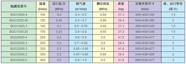 4、揚(yáng)程、流量可通過氣閥開度實(shí)現(xiàn)無級調(diào)節(jié)(氣壓調(diào)節(jié)在1-7bar之間)