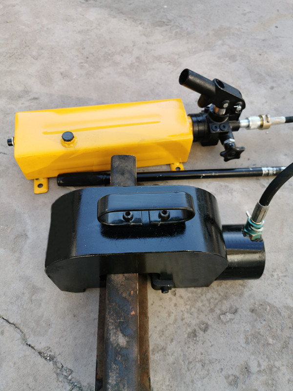 2、將液壓起道機側(cè)鉤橫向插入需要起道的位置,并將頂柱垂直于地面,將操縱桿插入撳手孔內(nèi),緩慢撳動操縱桿,使柱塞泵芯作往復(fù)運動,側(cè)鉤將帶動路軌向上運動達(dá)到起道目的,在被起路軌下墊上適當(dāng)?shù)哪緣K,緩慢打開回油閥,讓路軌下到木塊上,適度給機器頂柱或側(cè)鉤向下旋壓,讓機器復(fù)位,關(guān)閉回油閥,旋緊通氣閥,卸去起道機。