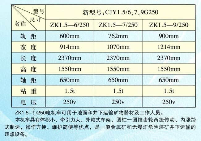 原型號(hào)ZK3-6、7、9/250-2型電機(jī)車(chē)主要技術(shù)參數(shù)