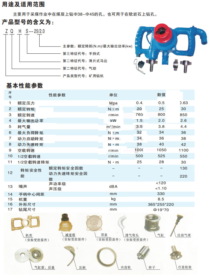 ZQHS-25/1.9(ZQHS-25/2.0)氣動手持式鉆機主要技術(shù)參數(shù):
